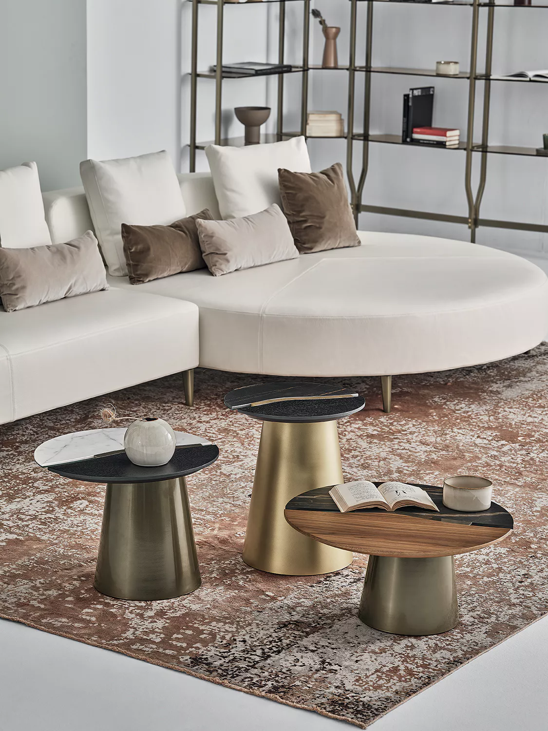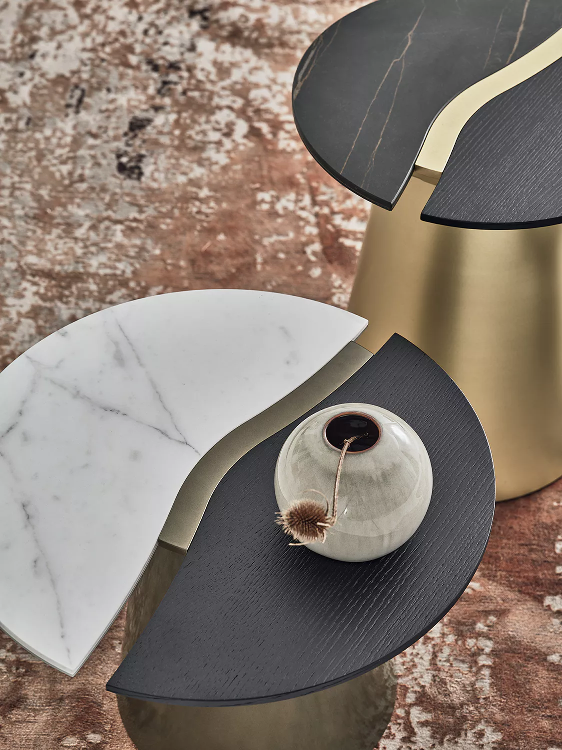 Elegantný konferenčný stolík s pevnou kovovou konštrukciou, ktorá dodáva stabilitu aj moderný vzhľad. Rám je doplnený o jemné dekoratívne prvky, ktoré zvýrazňujú jeho dizajnový charakter. Vrchná doska je vyrobená z kombinácie kvalitného materiálu Spermarble a prírodnej dyhy, čím vytvára harmonické spojenie luxusného vzhľadu a trvácnosti.